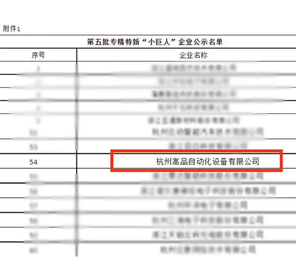 根據(jù)工信部統(tǒng)一部署,7月14日,浙江省經(jīng)信廳發(fā)布了《關(guān)于浙江省第五批專精特新“小巨人”企業(yè)和第二批專精特新“小巨人”復(fù)核通過企業(yè)名單的公示》。根據(jù)公示,全省共有384家企業(yè)新入圍第五批專精特新“小巨人”企業(yè)名單,其中杭州企業(yè)117家,位居全省第一。杭州高品自動(dòng)化設(shè)備有限公司榜上有名!