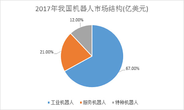 2017年我國機(jī)器人市場規(guī)模達(dá)到62.8億美元,2012-2017年的平均增長率達(dá)到28%。其中,工業(yè)機(jī)器人42.2億美元,服務(wù)機(jī)器人13.2億美元,特種機(jī)器人7.4億美元。