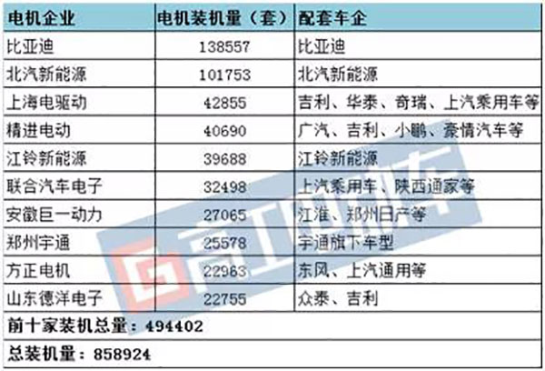 根據(jù)數(shù)據(jù)顯示,2017年電機(jī)裝機(jī)量排行前十名的企業(yè)有比亞迪、北汽新能源、上海電驅(qū)動(dòng)、精進(jìn)電動(dòng)、江鈴新能源等企業(yè),占據(jù)總裝機(jī)量的57.56%。其中,整車企業(yè)有4家,裝機(jī)數(shù)量占比超過6成。具體數(shù)據(jù)如下: